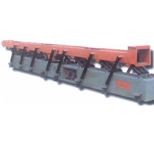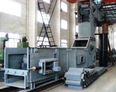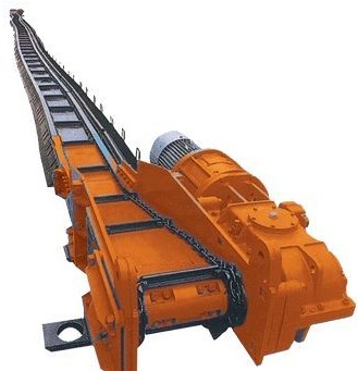 矿用刮板输送机由防爆电动机通过离心摩擦式联轴器、减速器、圆环链轮和机尾滚筒带动圆环链条上的刮板组成,其先进之处是:通过一种新型机头架改变电动机、联轴器、减速器在机头部的装配角度,使其在大倾角上运时呈近水平。在过渡槽中板下面安装防卡链板,设计加大中部槽的装载深度。采用该矿用刮板输送机能降低事故率和材料消耗,并能减少巷道掘进长度和运输设备数量。
