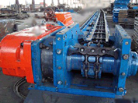 矿用刮板输送机属于煤矿运输机械。矿用刮板输送机用以解决煤矿15°-25°大倾角上山运输时,减速器倾角大、润滑不良、漏油、离心摩擦式联轴器进油打滑引发火灾,电动机烧损,过渡槽中卡链、断链、物料易滚落等问题。