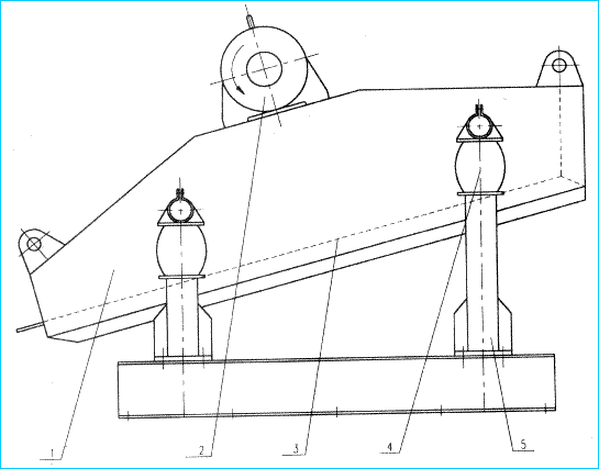 1-筛箱 2-惯性电机 3-筛面 4-橡胶簧 5-支座