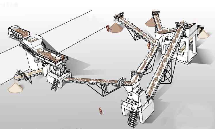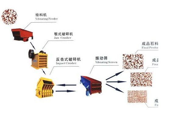 砂石由给料机均匀地送进粗碎机进行初步破碎,然后,产成的粗料由胶带输送机输送至反击式破碎机进行进一步破碎,细碎后的石料进振动筛筛分出不同规格的石子,不满足粒度要求的石子返料进反击式破碎机再次破碎。