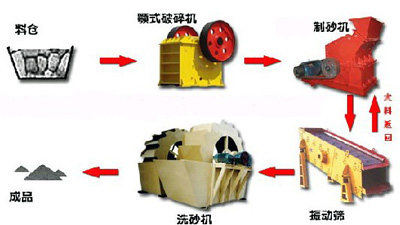 大块石料经料仓由振动给料机均匀地送进鄂式破碎机进行粗碎,粗碎后的石料由胶带输送机送到反击式破碎机进行进一步破碎;细碎后的石料由胶带输送机送进振动筛进行筛分,筛分出几种不同规格的石子,满足粒度要求的石子由成品胶带输送机送往成品料堆;不满足粒度要求的石子由胶带输送机返料送到反击式破碎机进行再次破碎,形成闭路多次循环。成品粒度可按照用户的需求进行组合和分级,为保护环境,可配备辅助的除尘设备。