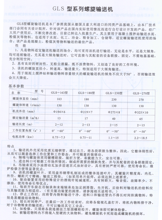- 螺旋机不宜输送易变质的、粘性大的、易结块的物料,因为这些物料在输送时会粘结在螺旋上,并随之旋转而不向前移动或者在吊轴承处形成物料的积塞,而使螺旋机不能正常工作。