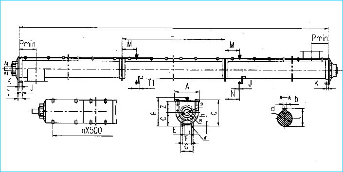 注:1、螺旋机输送长度及尺寸L均见表二、表三。 2、图n×500为盖板卡子尺寸,n值视螺旋机长度而定。 3、图中尺寸p为进出料口中心线。